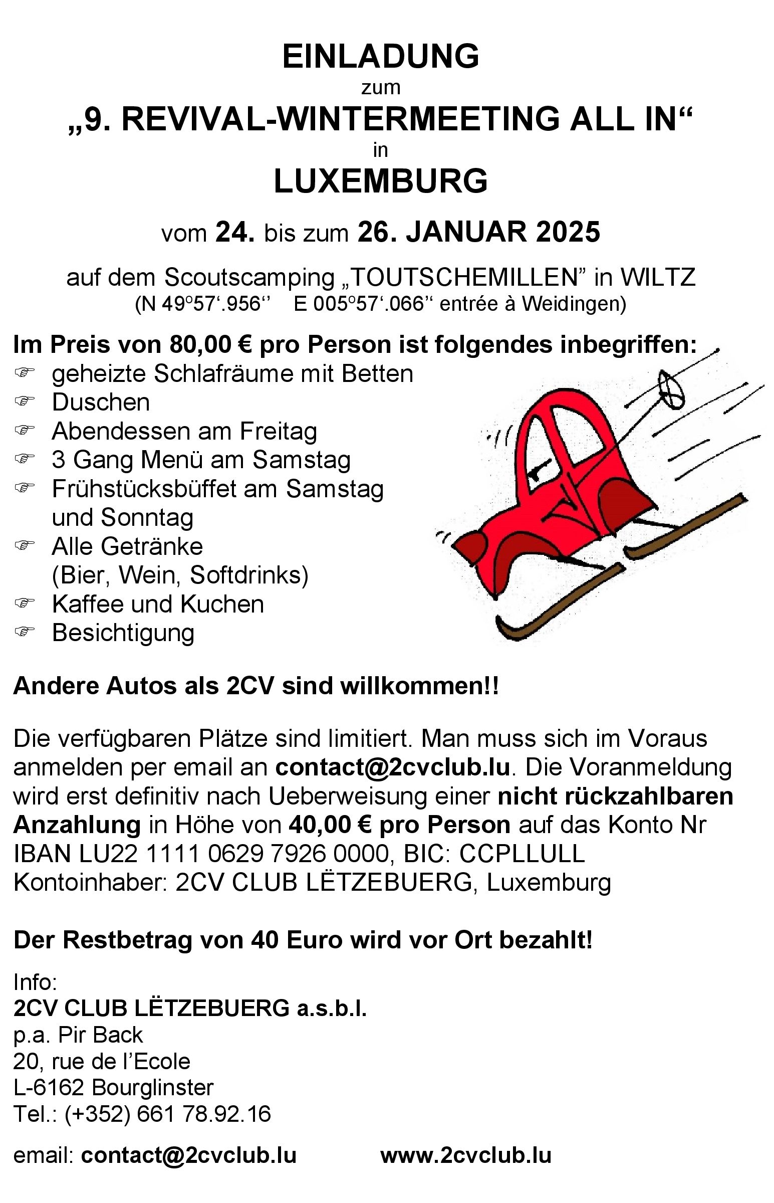 auf dem Scoutcamping "Toutschemillen" in Wiltz. Anmeldung erforderlich. Kosten 80 Euro, davon 40 Euro bei Anmeldung zahlbar. Info: http://www.2cvclub.lu, email: contact @ 2cvclub.lu